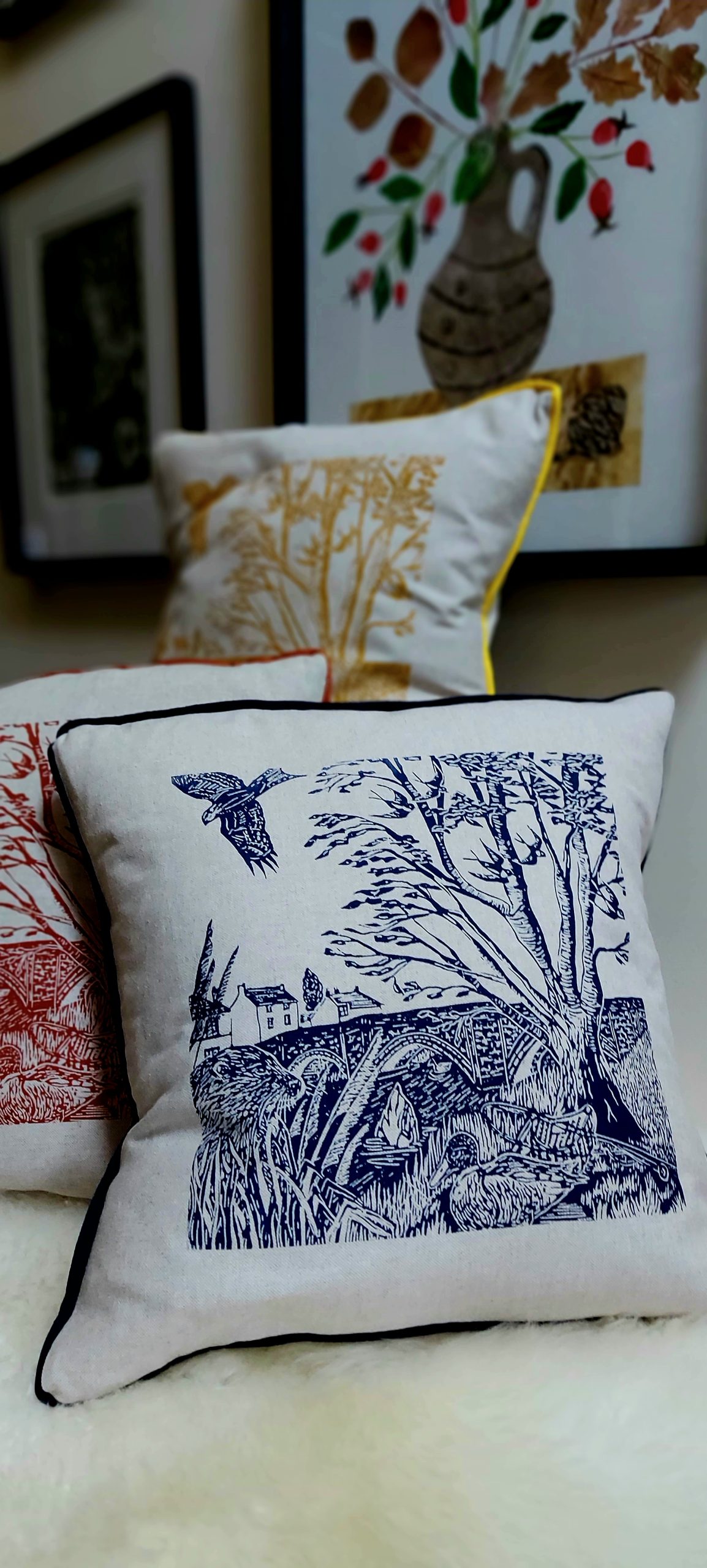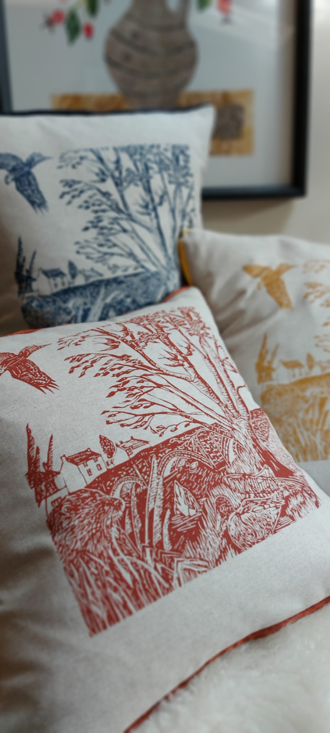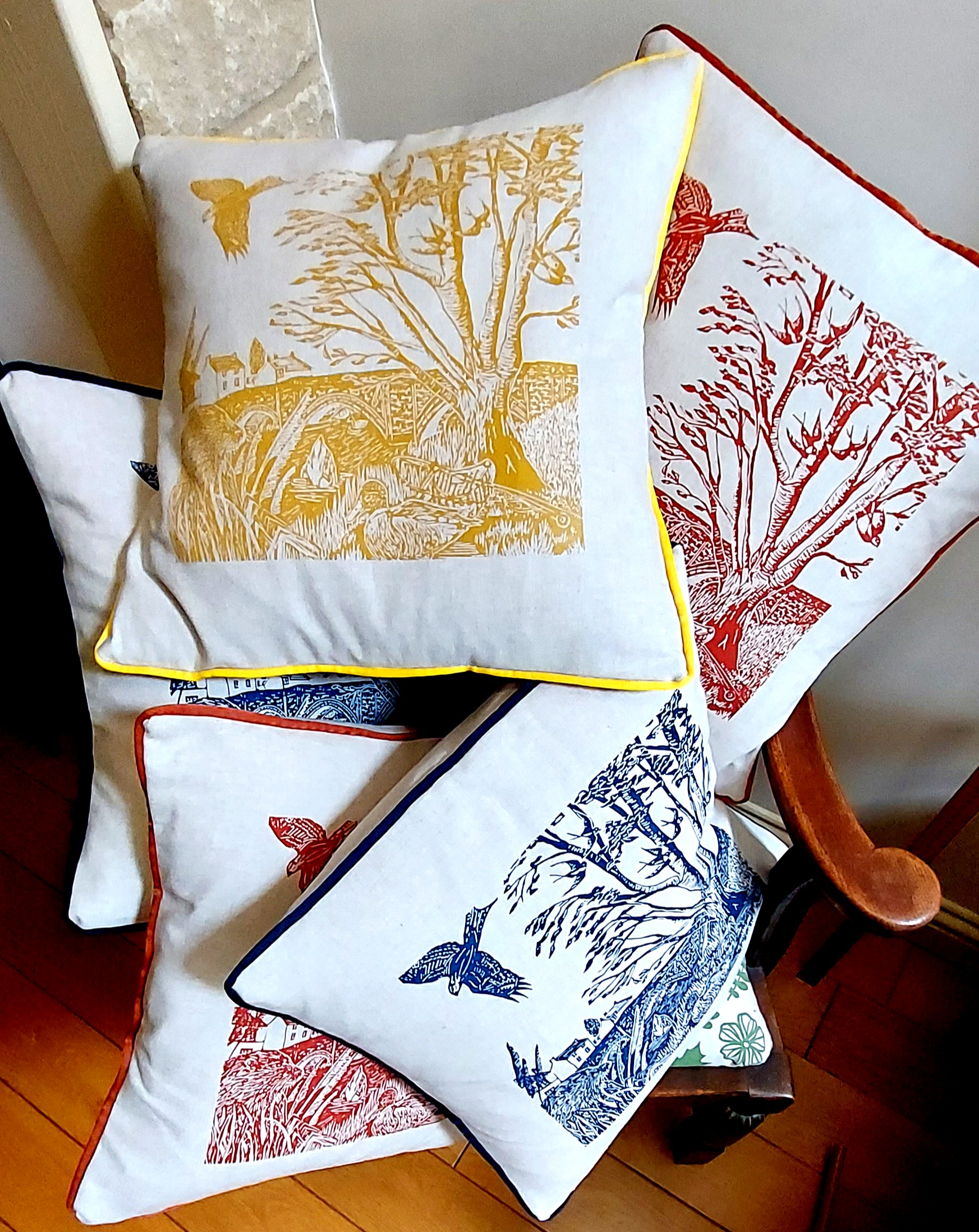 Add character, colour and craftmanship to your home with my handmade, hand screen-printed cushions, created using my original linocut artwork. Each piece is printed on to high quality fabric and carefully sewn to create a cushion that’s both beautiful and made to last.
