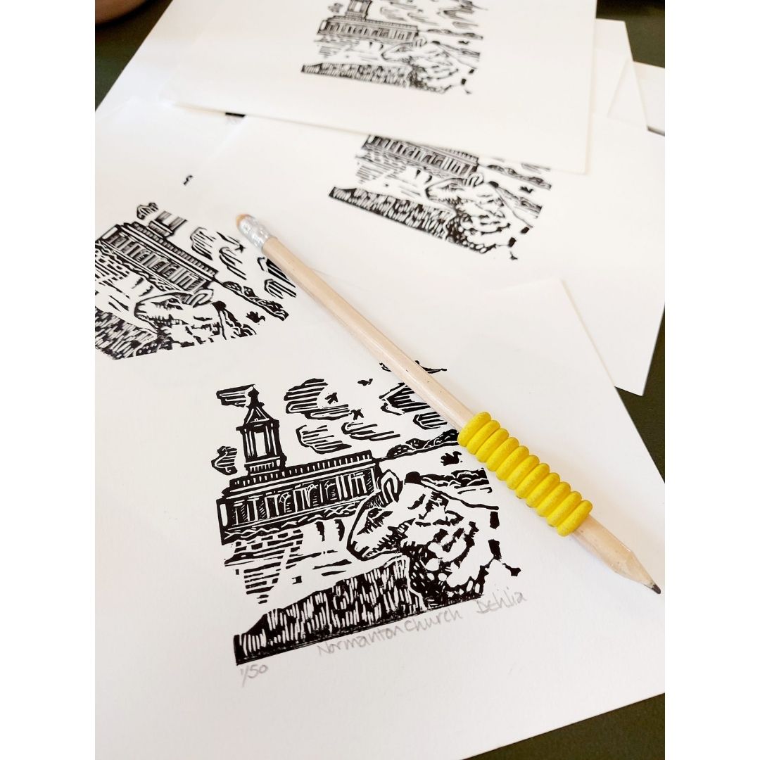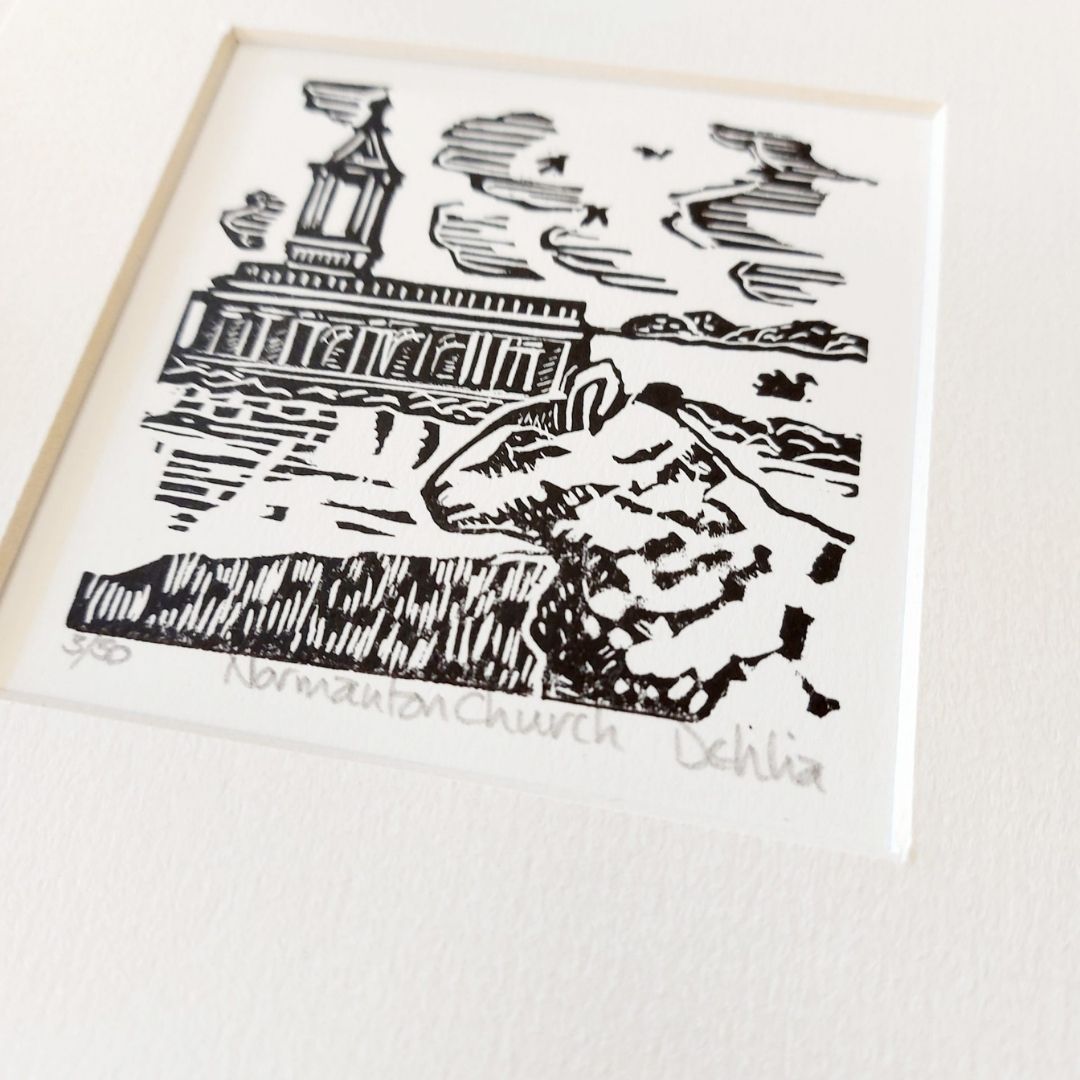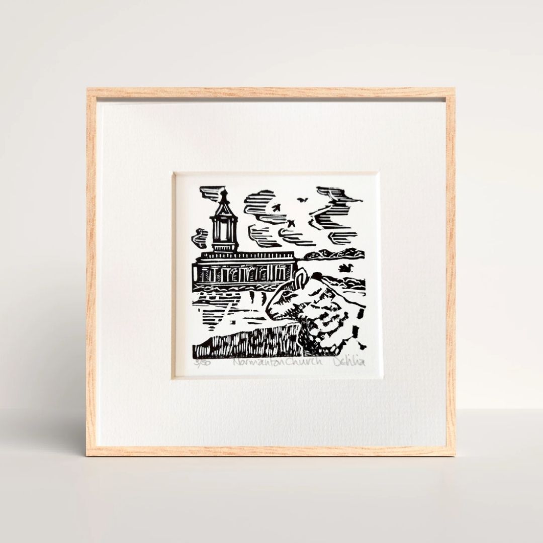 This original hand carved and handprinted linocut print captures the charm of the church, with one of the many nearby sheep looking on adding a somewhat quirky touch.