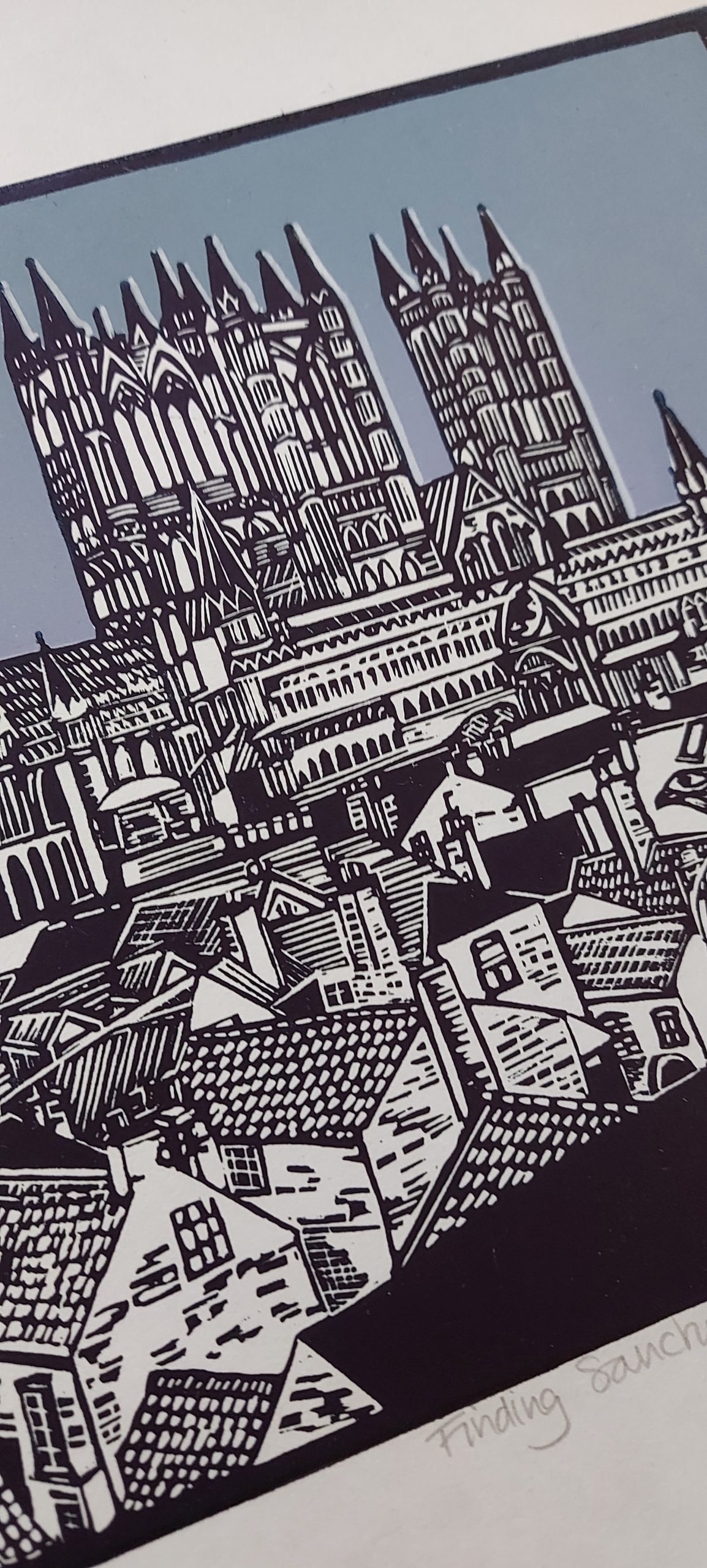This original linocut print titled ‘Finding Sanctuary’ is a varied edition. It features the beautiful majestic cathedral overlooking the rooftops of the city of Lincoln in Lincolnshire. The Cathedral has been a place of sanctuary for centuries. But when I visited, a family of peregrine falcons had decided that this ancient place of worship would make the perfect place to nest. I found this both wonderful and fun too, so I have woven the story of these beautiful birds into my design. It is a view of the cathedral from the castle walls.
