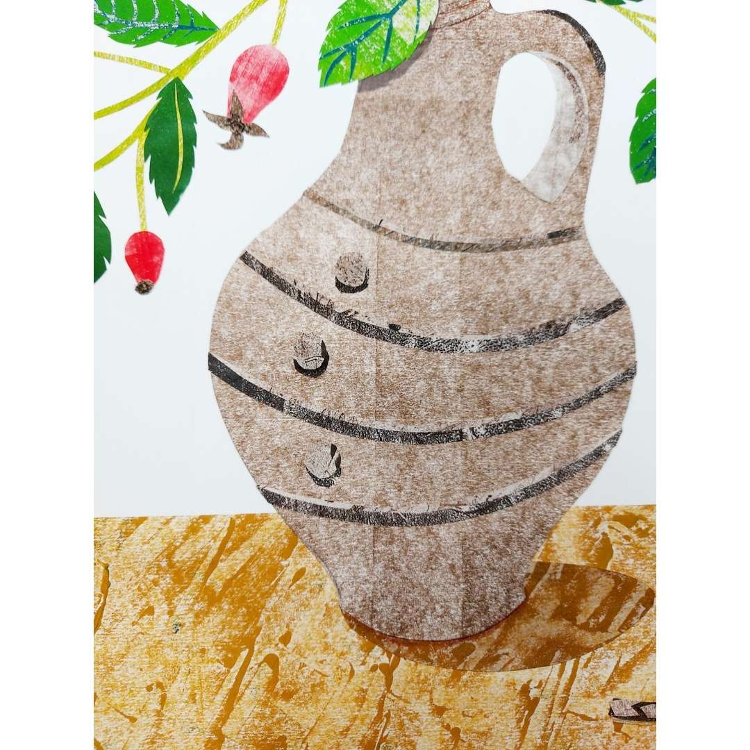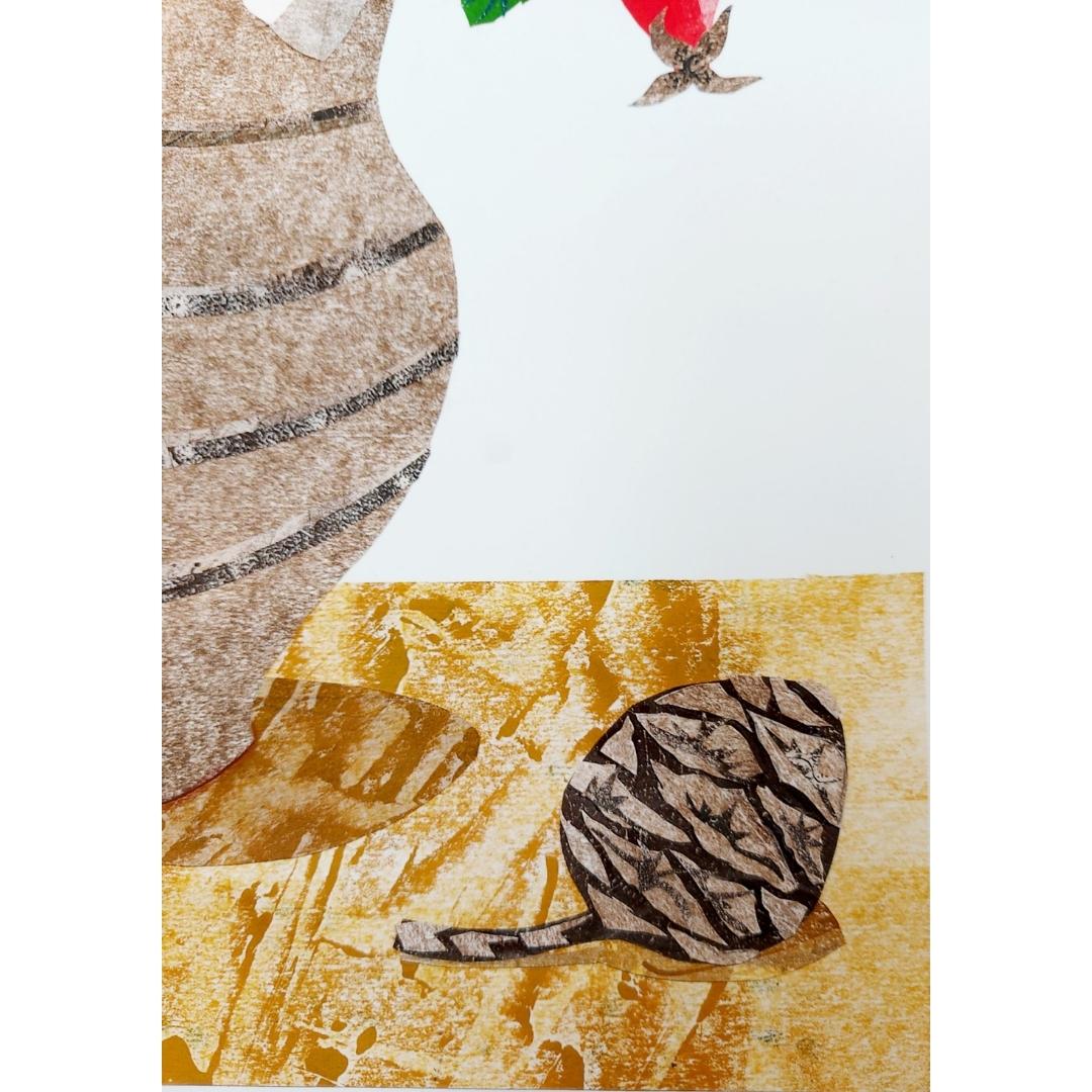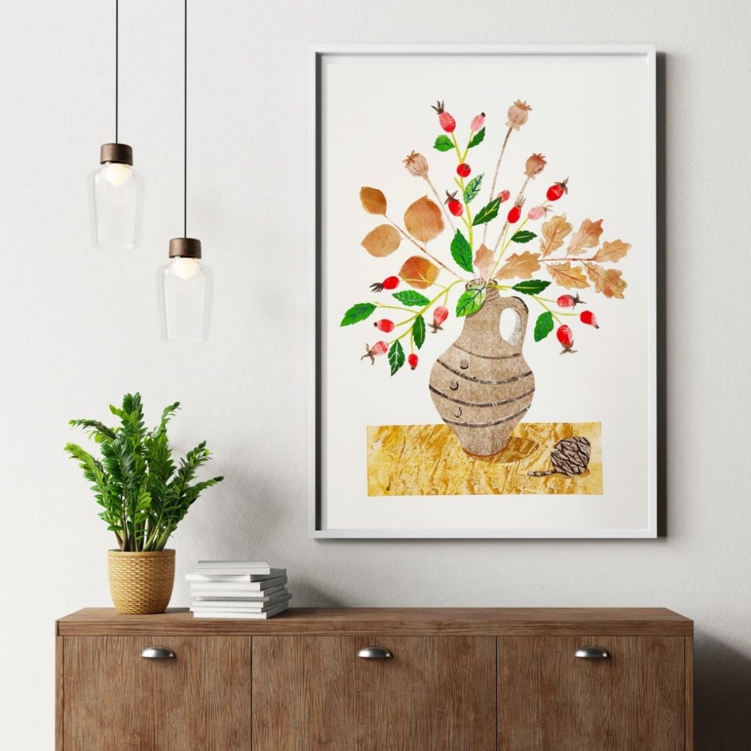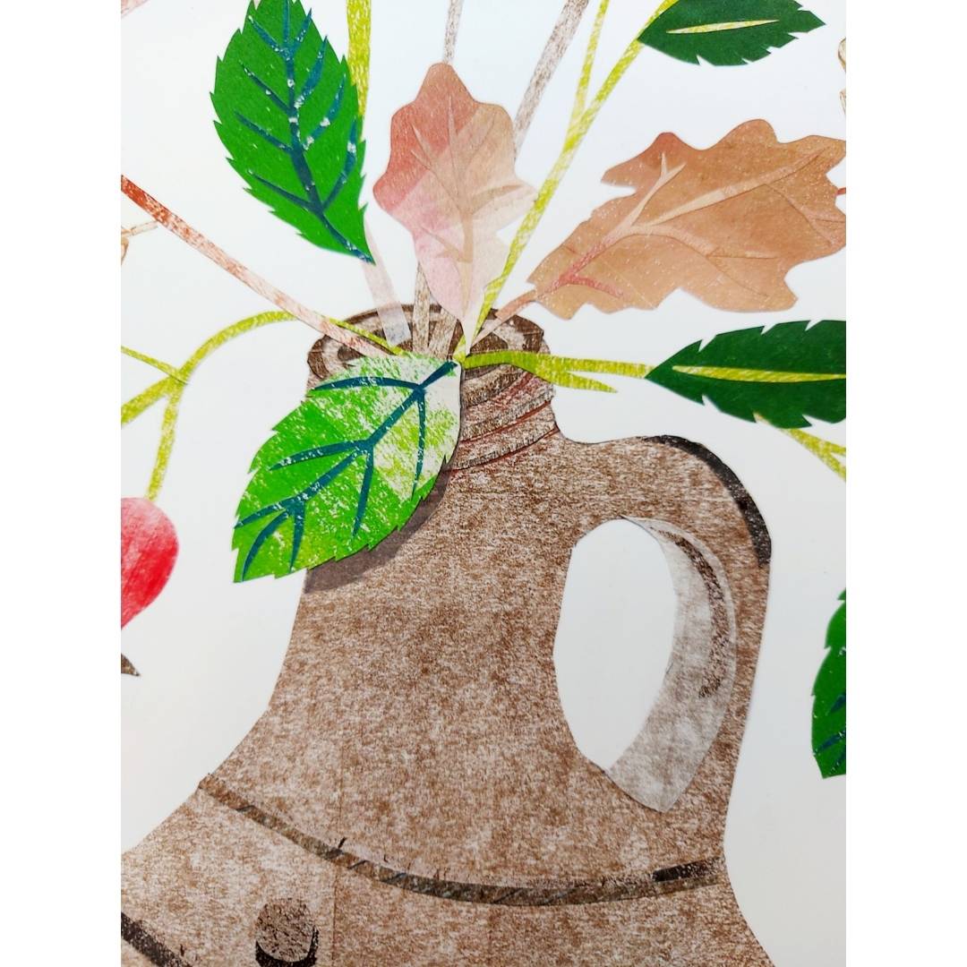 My original hand cut paper collage painting is inspired by a beautiful pot crafted by Phil Rogers from my collection. I arranged poppy seedheads and autumnal foliage, collected whilst out on my rambles,  in the pot and began to sketch them. From this sketch, I used the textured papers created after cleaning off my printmaking tools to create this still life collage.