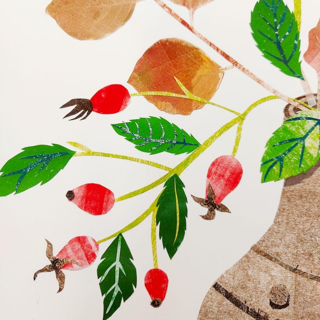The earthy tones of the foliage and shelf are complimented by the vibrant reds and greens of the rosehips and leaves which, I think, evoke the joyful atmosphere of Autumn.