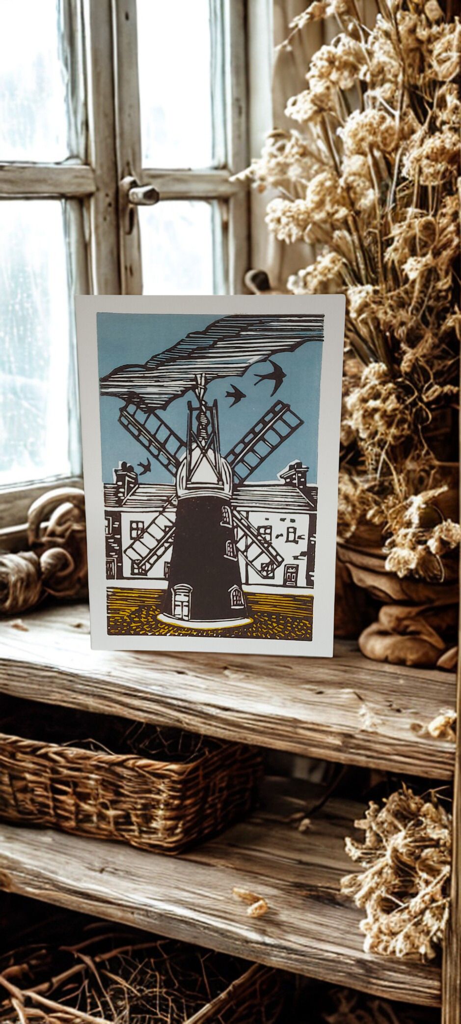 This greeting card features a Ellis Windmill in Lincoln. The design has been reproduced from my original hand-carved linocut print, inspired by a trip to the city and traditional printmaking techniques.